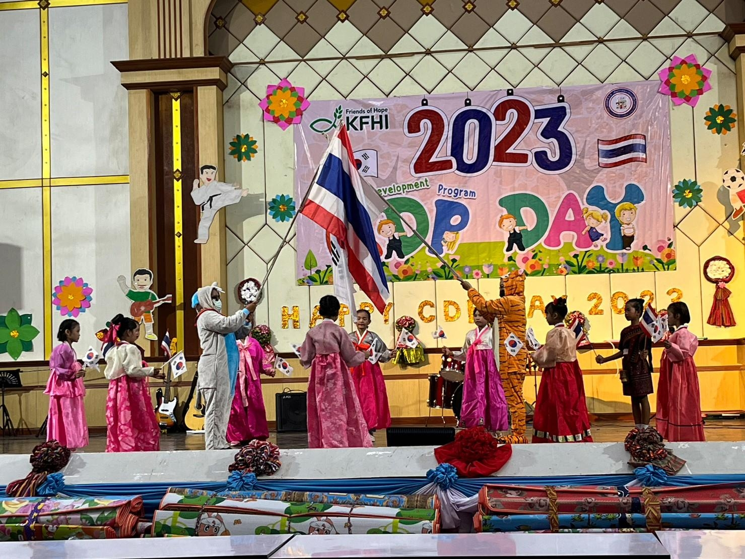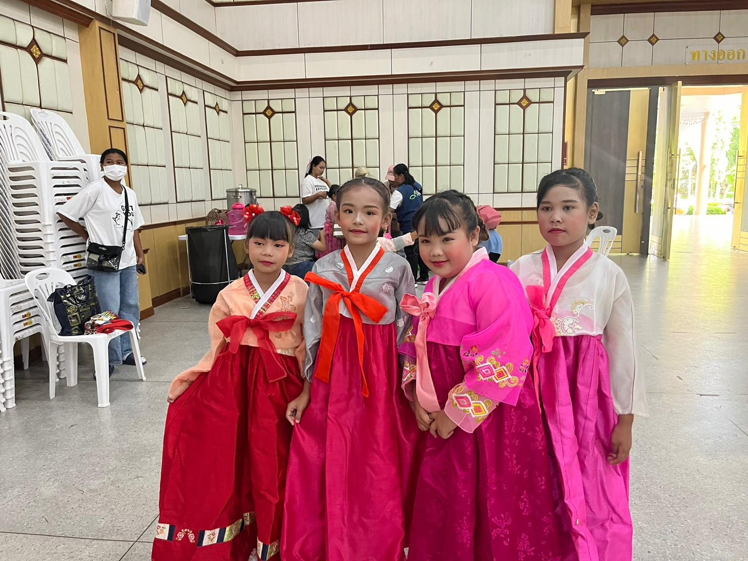 태국 아이들이 한국 전통 의상을 입고 태극기와 태국국기를 동시에 흔든다는 것이