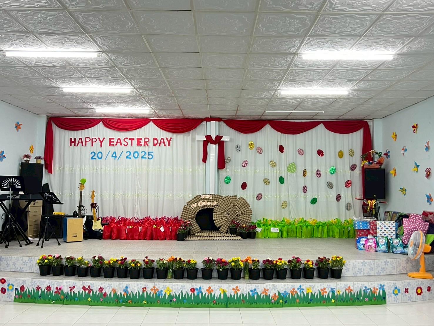 안녕하세요. 후원자님, YHC 9기 크루 린(승연)입니다. 현재 한국은 독감이 유행이라고 들었습니다.늘 몸조심하세요:) 이번에 전해드릴 즐거운 소식은 바로 부활절 예배입니다~올해에도 와린 예사랑 교회에서 아이들과 가족들 모두 모여 진행되었는데요! 즐거운 부활절 예배를 위해 교회도 예쁘게 꾸미고아이들과 부모님들을 위한 많은 선물들과예쁜 포토존까지 마련이 되었습니다. 입구에서 방명록을 작성하고 들어가는데요.선생님께 이름과 사는 지역을 말하면선생님들이 체크해주셨습니다. 위선생님께서 사회를 맡아주셨고, 예사랑 교회 성도분께서 부활절 예배를 위한 기도를 해주셨습니다. 부활절 설명이 담긴 영상을 시청하고,찐다 목사님께서 부활절 설교를 해주셨습니다.부모님들도 아이들도 열심히 듣는 모습이 태국에서 쉽게 볼 수 없는 진..
